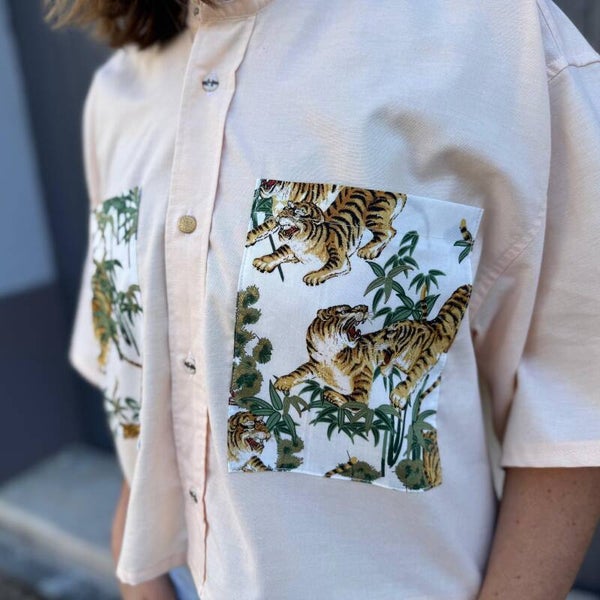 Les poches ont été créées à partir d’une chute d’un très beau tissu japonais, ajoutant une touche raffinée et originale à la pièce.
