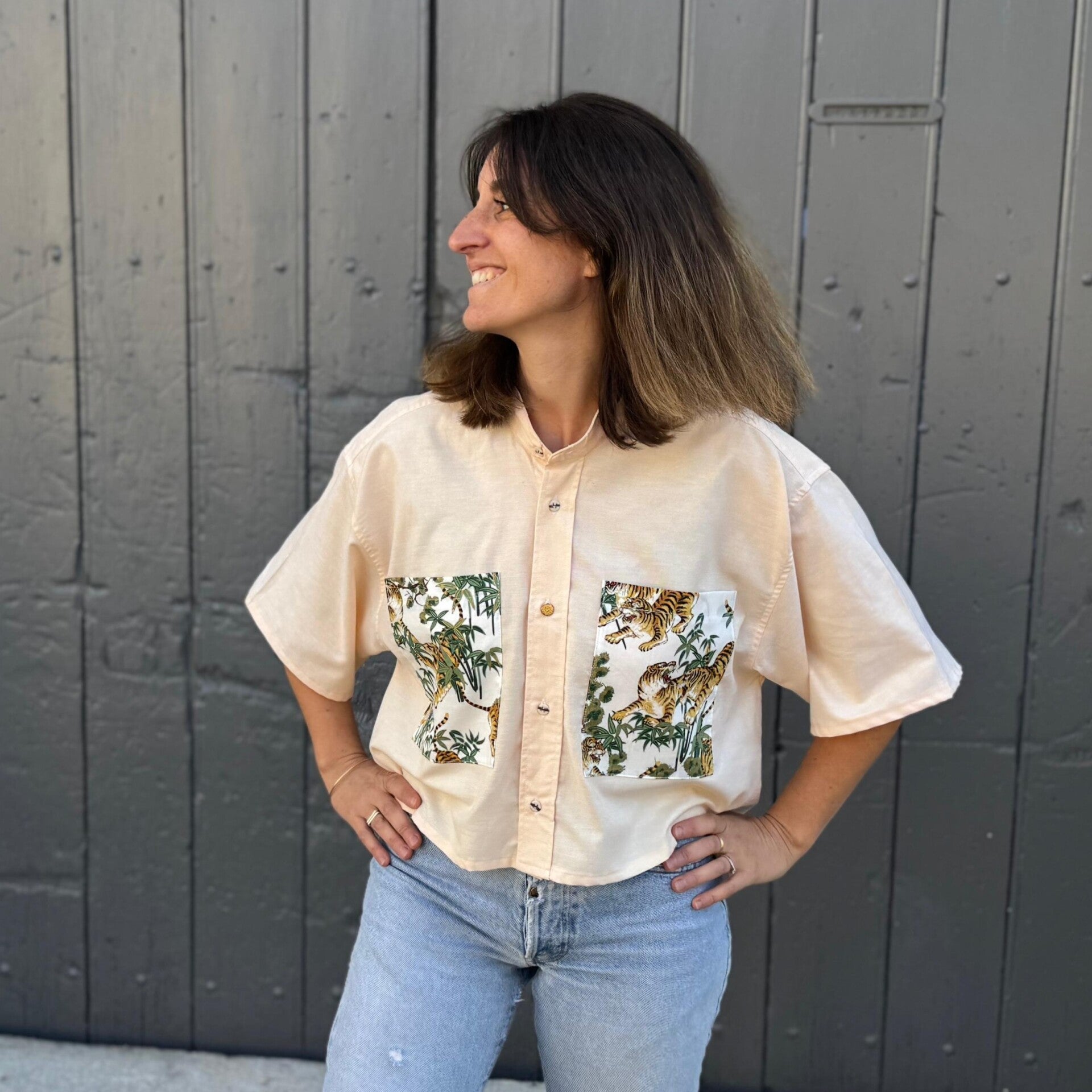 Elle est née d’une démarche d’upcycling : confectionnée à partir d’une chemise homme de seconde main soigneusement sélectionnée chez Emmaüs, elle a été transformée pour lui donner une nouvelle vie, moderne et intemporelle.