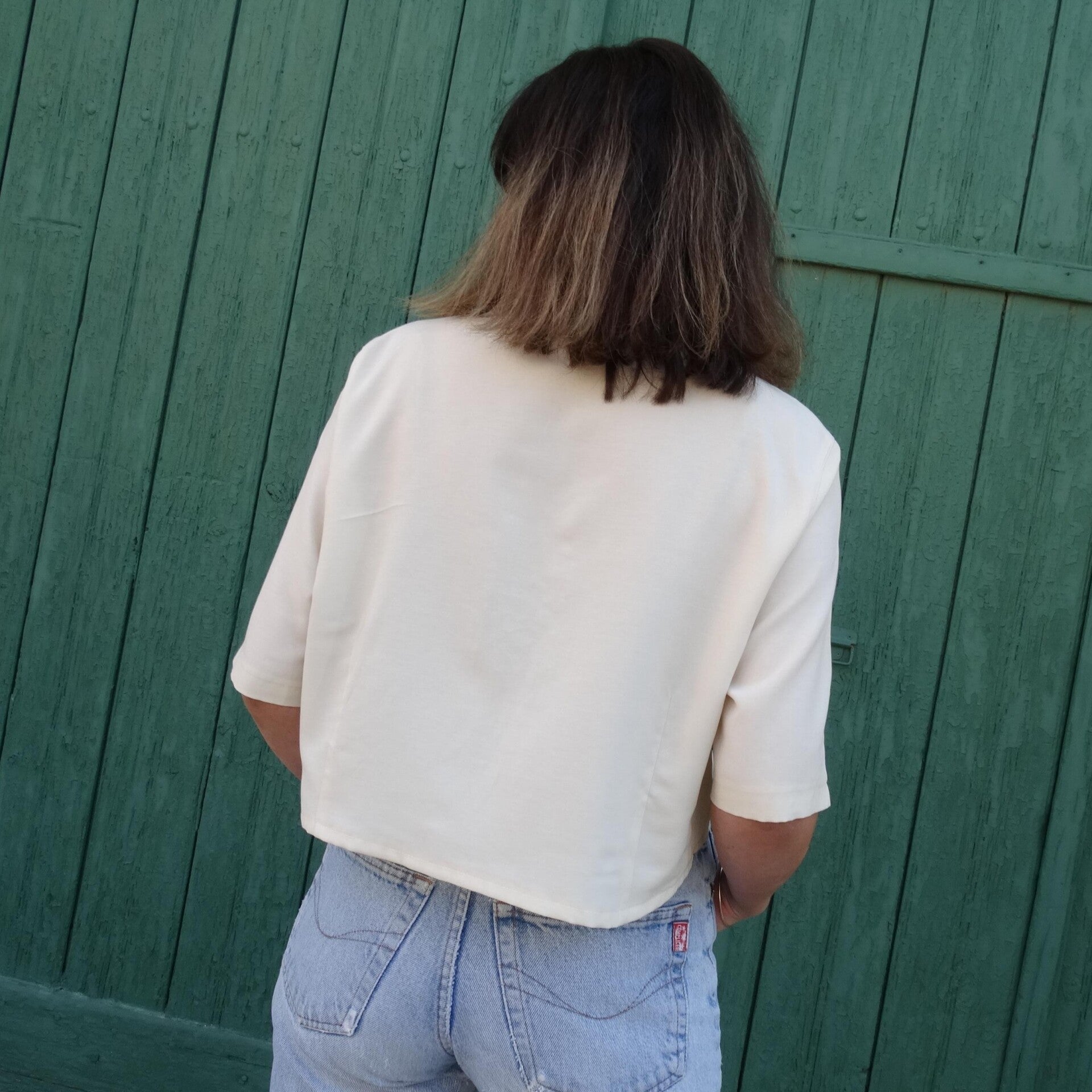 Elle est née d’une démarche d’upcycling, à partir d’une chemise femme de seconde main chinée chez Emmaüs, à laquelle j’ai redonné une nouvelle vie.